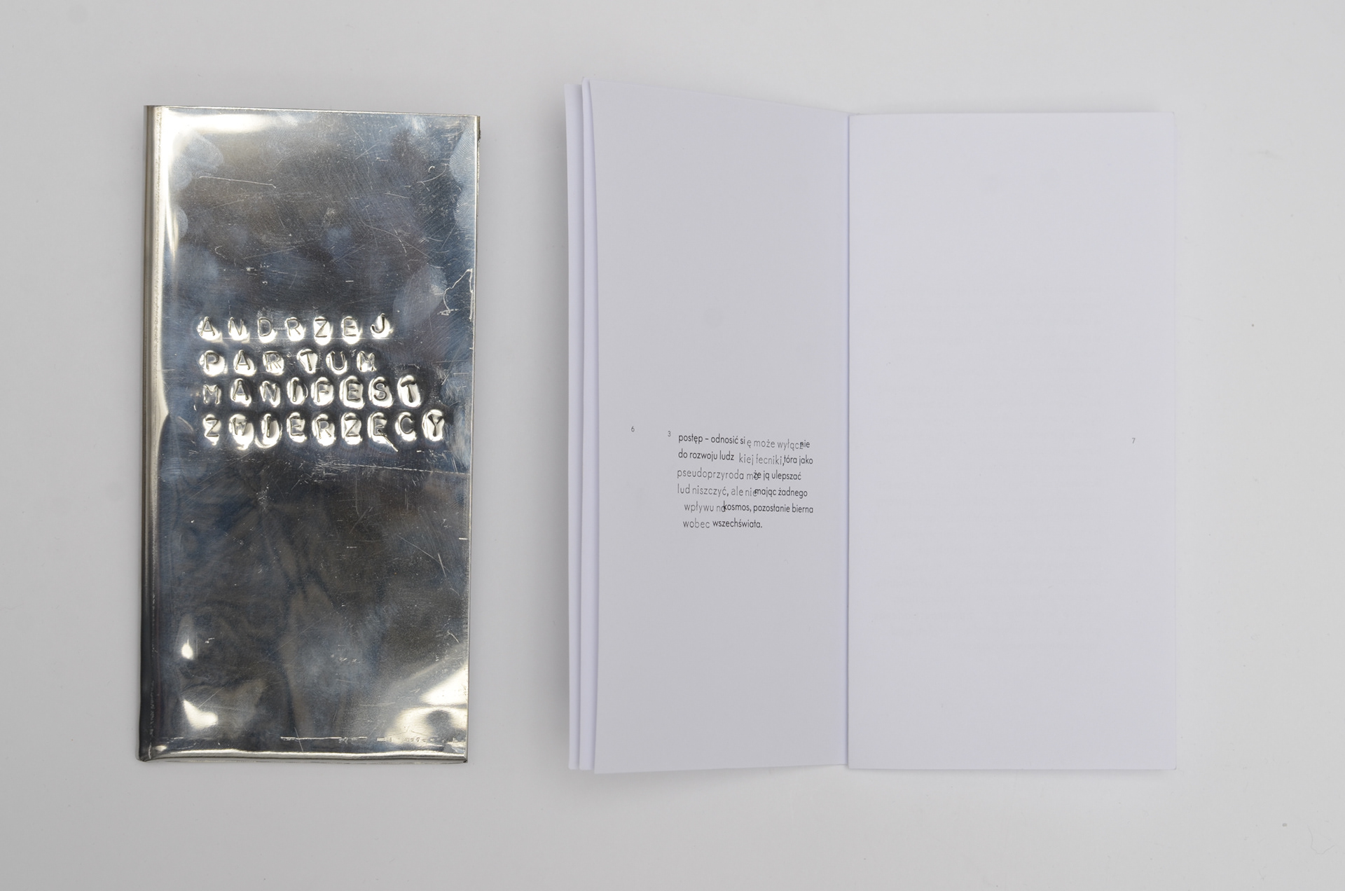description: In the Animal Manifesto, the author explores the instinctive side of humans and their tendency to build a mechanised, systematised environment around themselves. My publication is an attempt to create a relationship between text recorded in various ways. Systems that were designed to produce identical results each time, when touched by the human hand, take on something of its organic nature.
